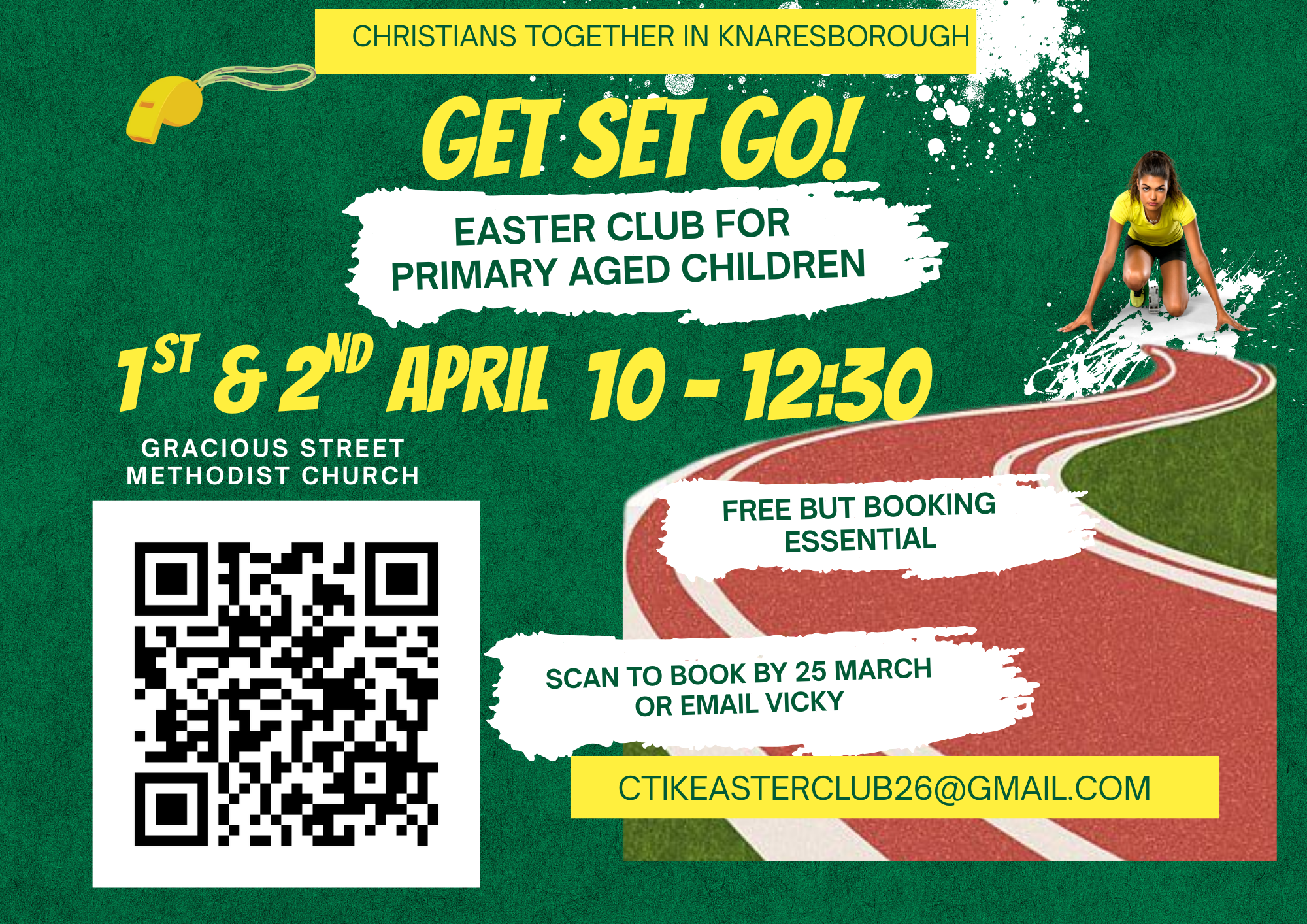 Christians Together in Knaresborough 2026 Easter Club, ‘Get, Set…GO!’ will take place on Wednesday 1st April and Thursday 2nd April from 10.00am-12:30pm at Gracious Street Methodist Church. It is open to all primary school aged children.